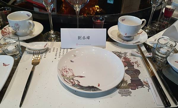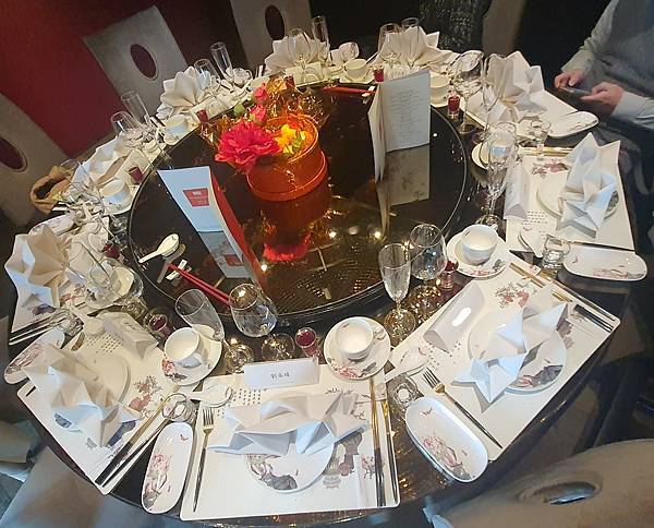 *包廂內十個位置、椅子中間有個洞放圍巾好方便XD、中間有水果籃很喜氣、當日菜單居然有兩份!(以前在飯店有服務經驗的我也只看過一份