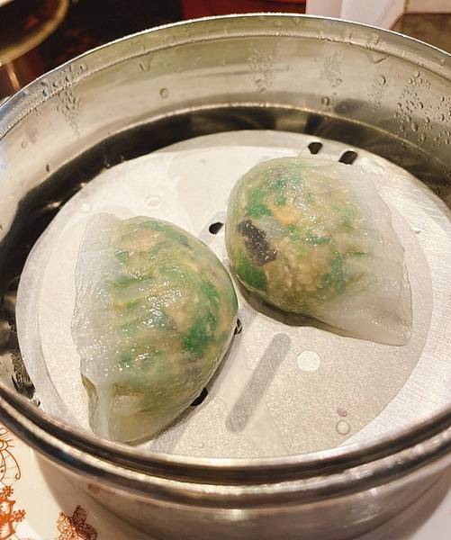 *金銀蛋蒜香莧菜餃: 外皮像是水晶餃、但是十分薄,、一吃就可以吃到裡面豐富的味道,個人很喜歡!