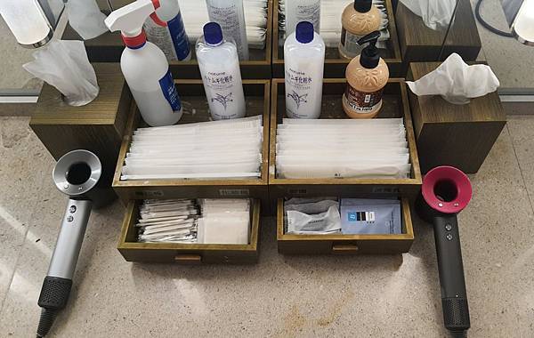 *整個驚呆:居然有一包包的洗面乳、茶籽堂的乳液、薏仁化妝水,最意外是提供Dyson的吹風機!