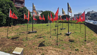 鋤頭作為開墾土地的主要器具,與拓墾史有密切關係,結合旗子轉化「墾地」、「插旗」和「劃界」的開墾意象。鋤頭尺寸被放大,旗子以客家花布繡上經田野訪查而來、半虛構出的平埔族群記憶。飄在風中那若有似無的過去,同時也是遙想原住民讓出土地給漢民的信物。(引用官網介紹)