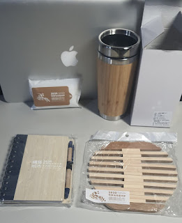 | 這次一共拿到的竹子墊、濕紙巾、筆記本、不鏽鋼杯 |